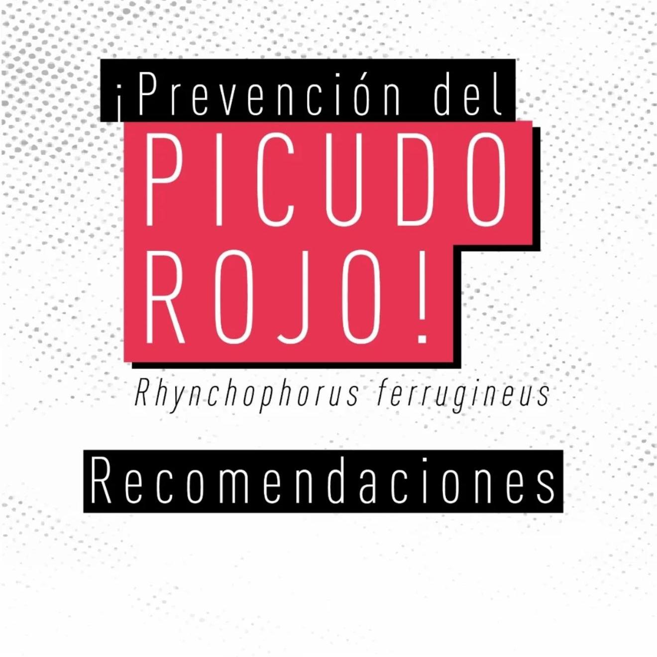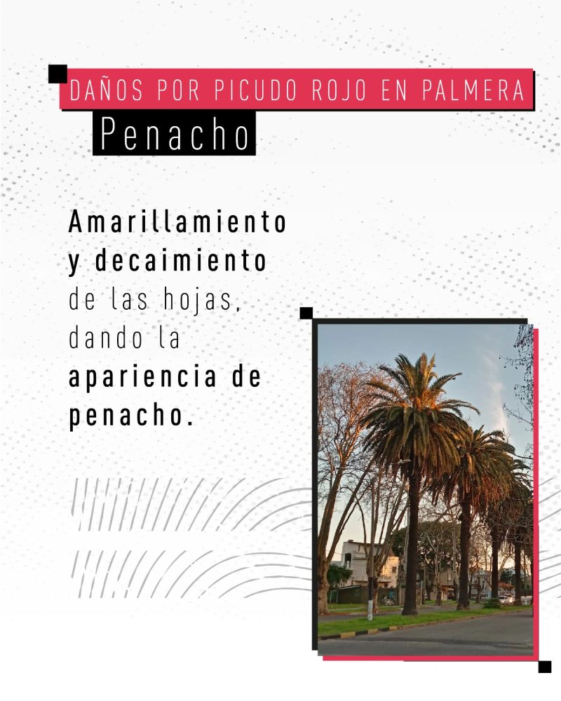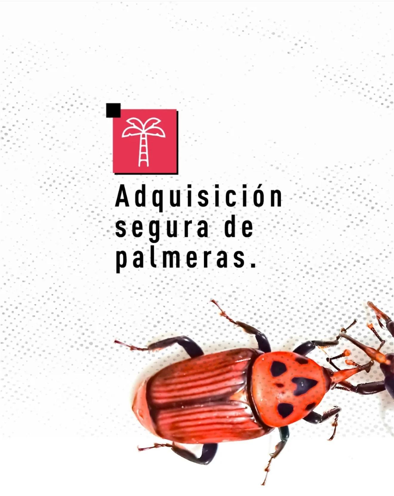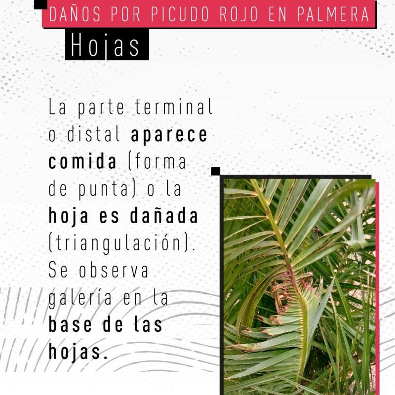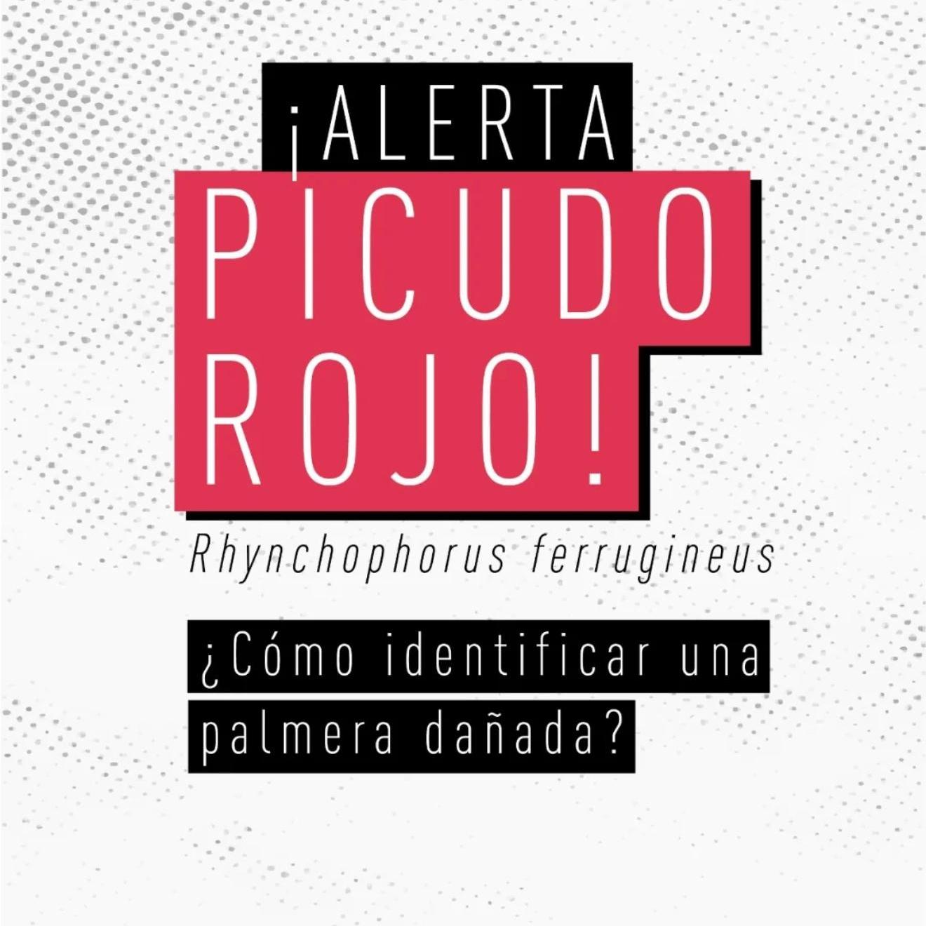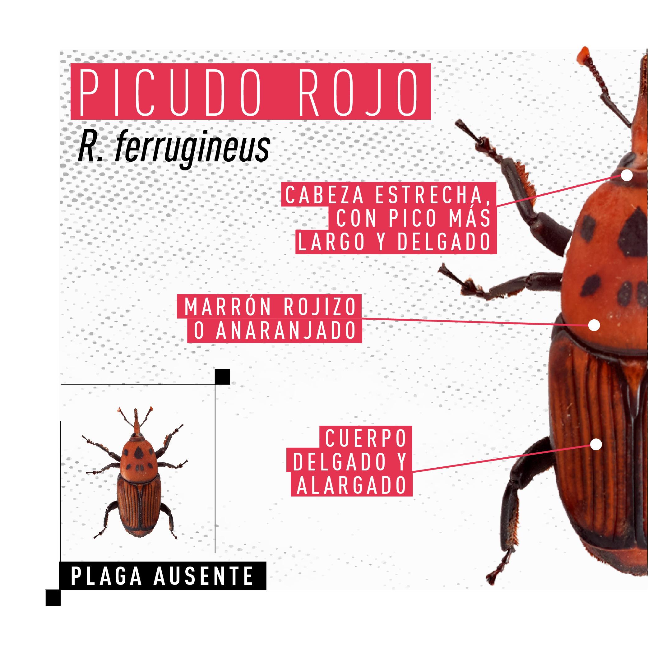 Rhynchophorus ferrugineus, conocido como picudo rojo de las palmeras, es una plaga cuarentenaria ausente en Argentina. Piezas desarrolladas para Rhynchophorus ferrugineus Picudo rojo 1.jpg Picudo rojo 2.jpg Picudo rojo vs negro 1.jpg Picudo rojo vs negro 2 - copia.jpg Picudo rojo vs negro 3.jpg Picudo rojo vs picudo negro 2.jpg Como identificar palmeras dañadas.jpg 1. Penacho.jpg 2. Forma de hongo.jpg 3. Asimetría.jpg 4. hojas.jpg Picudo rojo vs vaquita de las palmeras 1.jpg Picudo rojo vs vaquita de las palmeras 3.jpg Picudo rojo vs vaquita de las palmeras 2.jpg 1. Recomendaciones.jpg 2. Adquisición segura de palmeras.jpg 3. Reducir al minimo la poda.jpg 4. Vigilancia constante.jpg 5. No utilizar trampas de feromonas y kairomonas.jpg Descargar PDF. protocolo para la tala de palmeras.pdf Descargar PDF. protocolo seguridad.pdf