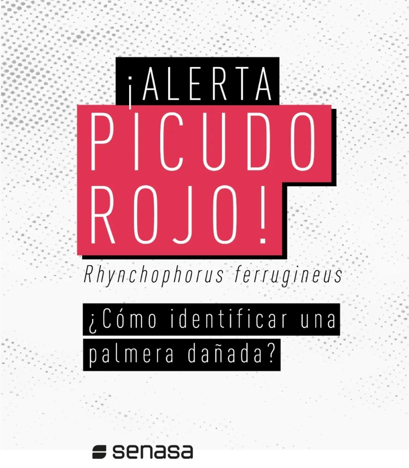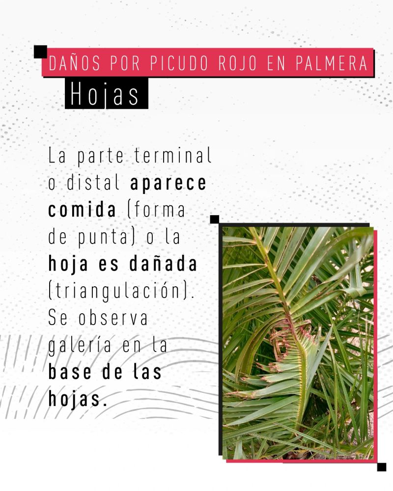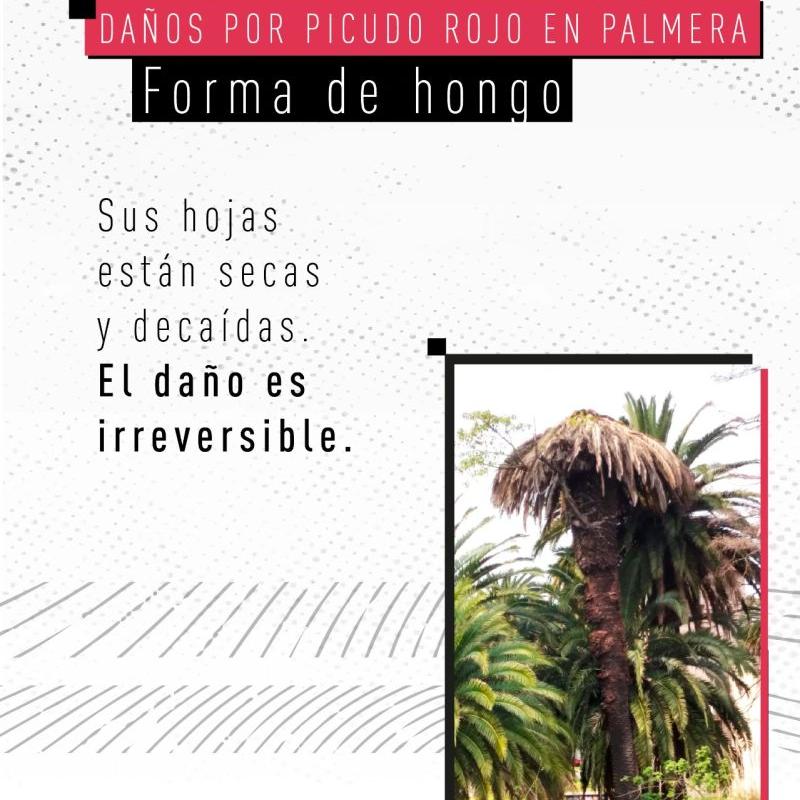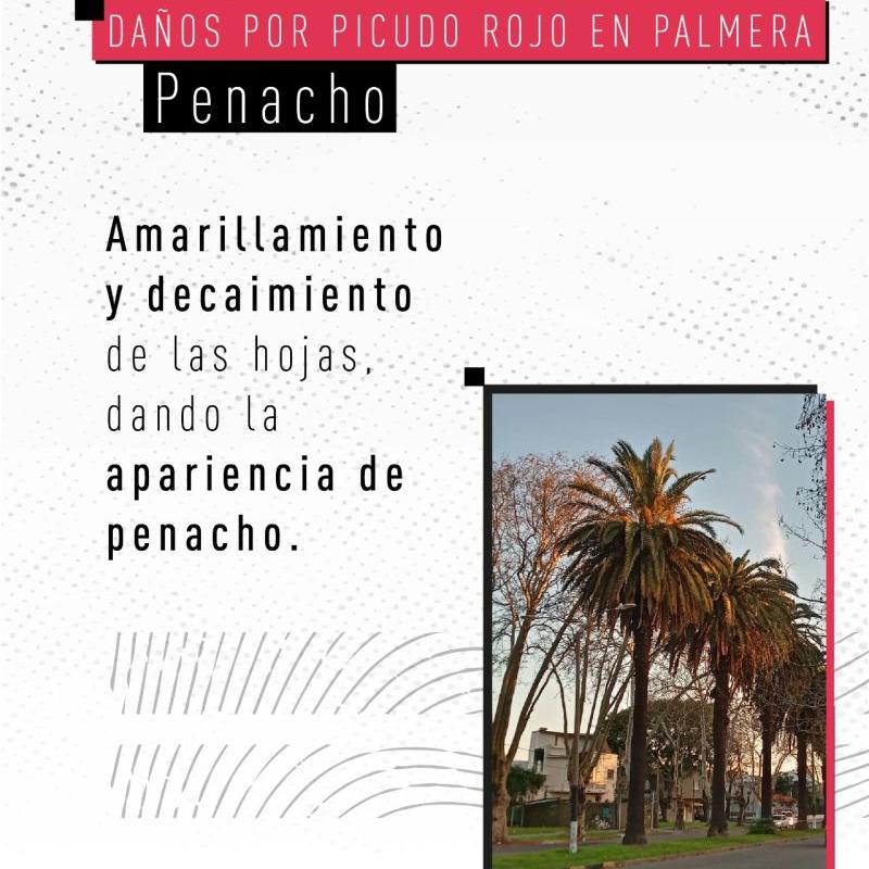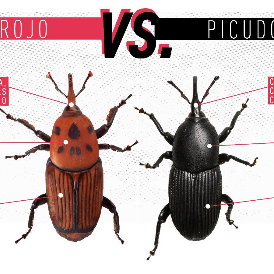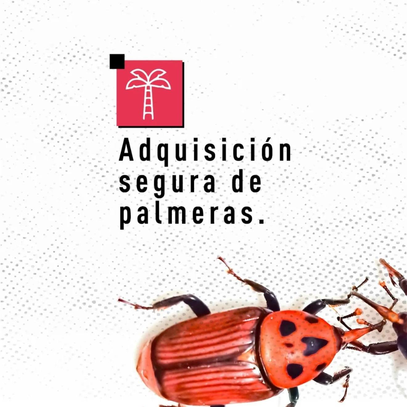 Rhynchophorus ferrugineus, conocido como picudo rojo de las palmeras, es una plaga cuarentenaria ausente en Argentina. Piezas desarrolladas para Rhynchophorus ferrugineus Picudo rojo 1.jpg Picudo rojo 2.jpg Picudo rojo vs negro 1.jpg Picudo rojo vs negro 2 - copia.jpg Picudo rojo vs negro 3.jpg Picudo rojo vs picudo negro 2.jpg Como identificar palmeras dañadas.jpg 1. Penacho.jpg 2. Forma de hongo.jpg 3. Asimetría.jpg 4. hojas.jpg Picudo rojo vs vaquita de las palmeras 1.jpg Picudo rojo vs vaquita de las palmeras 3.jpg Picudo rojo vs vaquita de las palmeras 2.jpg 1. Recomendaciones.jpg 2. Adquisición segura de palmeras.jpg 3. Reducir al minimo la poda.jpg 4. Vigilancia constante.jpg 5. No utilizar trampas de feromonas y kairomonas.jpg Descargar PDF. protocolo para la tala de palmeras.pdf Descargar PDF. protocolo seguridad.pdf