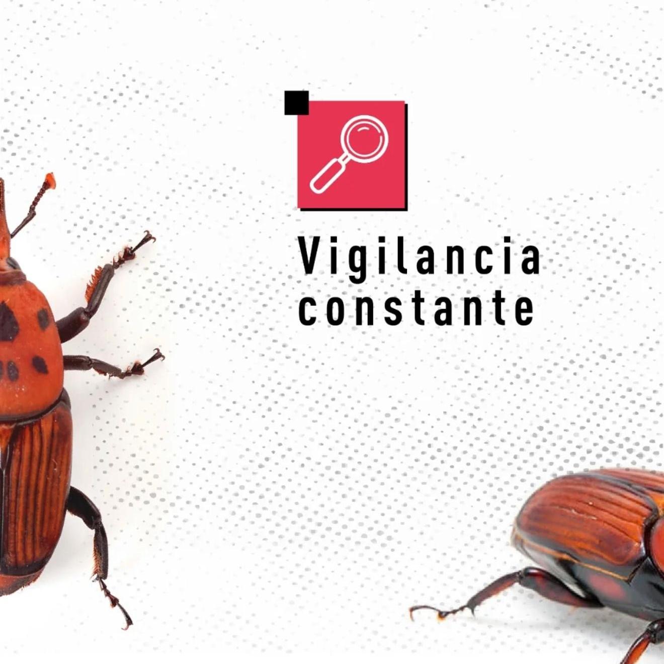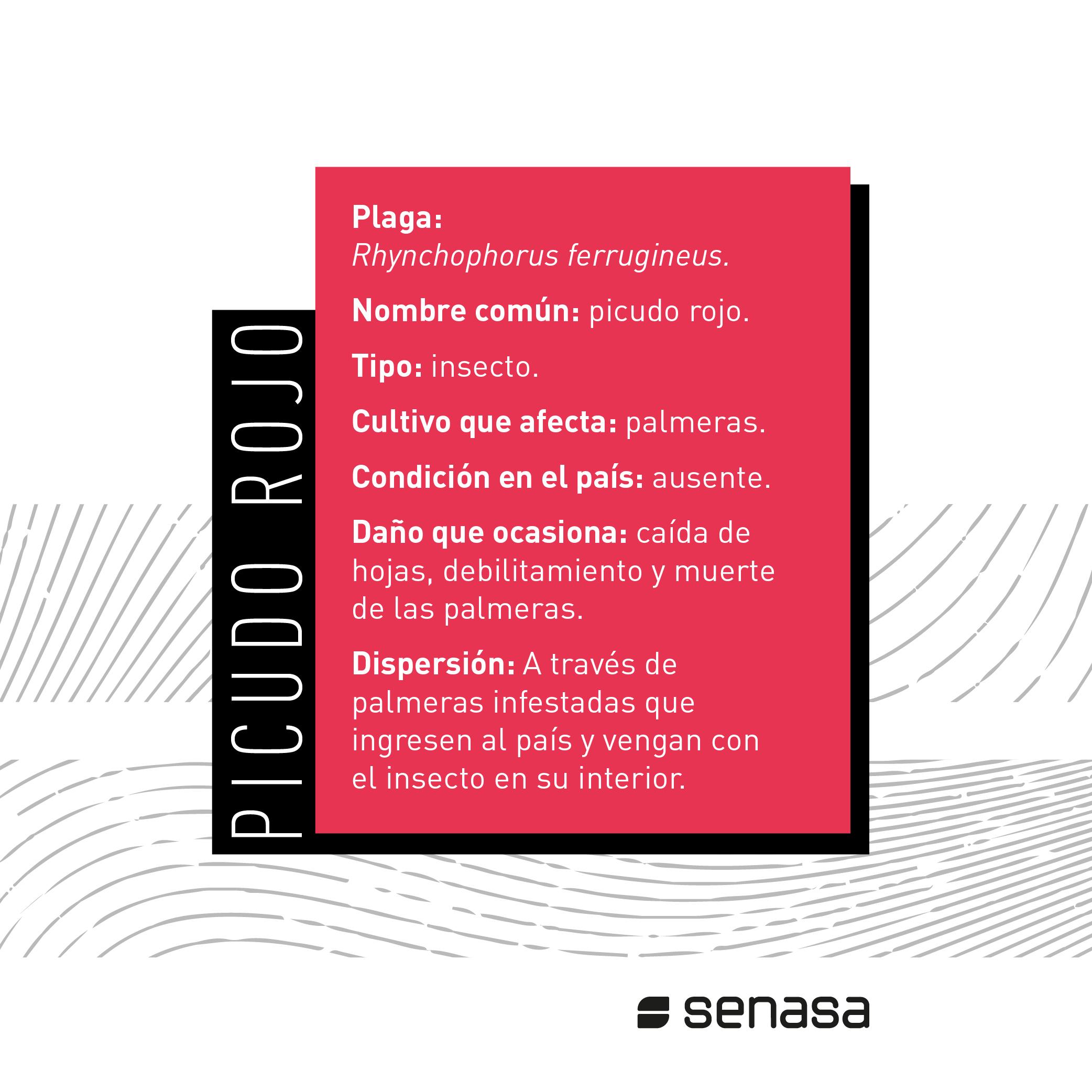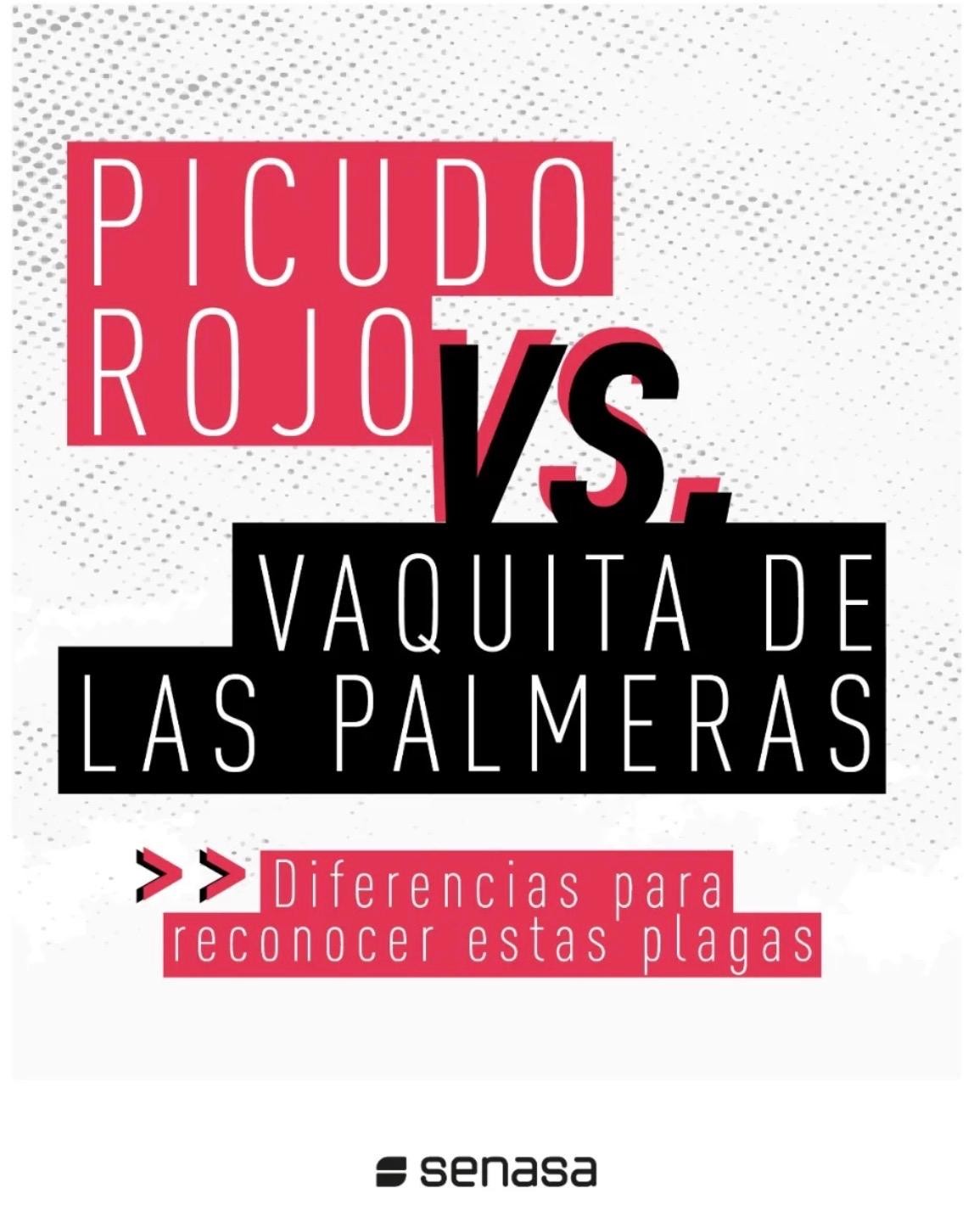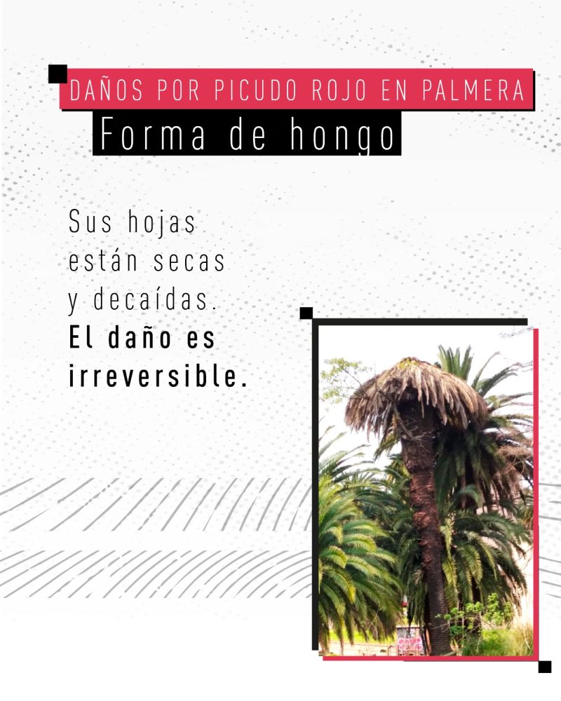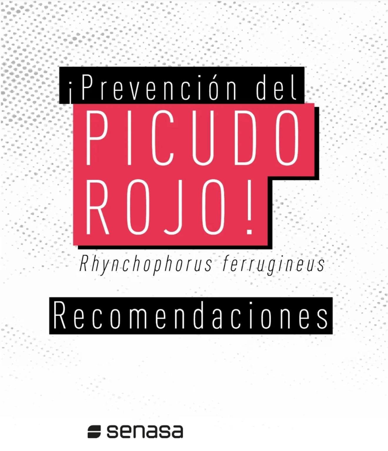Rhynchophorus ferrugineus, conocido como picudo rojo de las palmeras, es una plaga cuarentenaria ausente en Argentina. Piezas desarrolladas para Rhynchophorus ferrugineus Picudo rojo 1.jpg Picudo rojo 2.jpg Picudo rojo vs negro 1.jpg Picudo rojo vs negro 2 - copia.jpg Picudo rojo vs negro 3.jpg Picudo rojo vs picudo negro 2.jpg Como identificar palmeras dañadas.jpg 1. Penacho.jpg 2. Forma de hongo.jpg 3. Asimetría.jpg 4. hojas.jpg Picudo rojo vs vaquita de las palmeras 1.jpg Picudo rojo vs vaquita de las palmeras 3.jpg Picudo rojo vs vaquita de las palmeras 2.jpg 1. Recomendaciones.jpg 2. Adquisición segura de palmeras.jpg 3. Reducir al minimo la poda.jpg 4. Vigilancia constante.jpg 5. No utilizar trampas de feromonas y kairomonas.jpg Descargar PDF. protocolo para la tala de palmeras.pdf Descargar PDF. protocolo seguridad.pdf