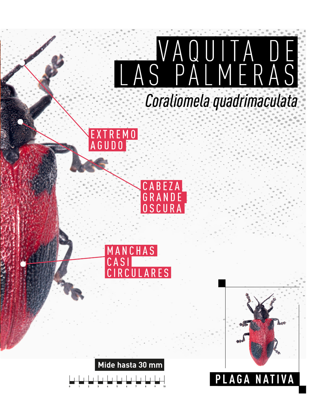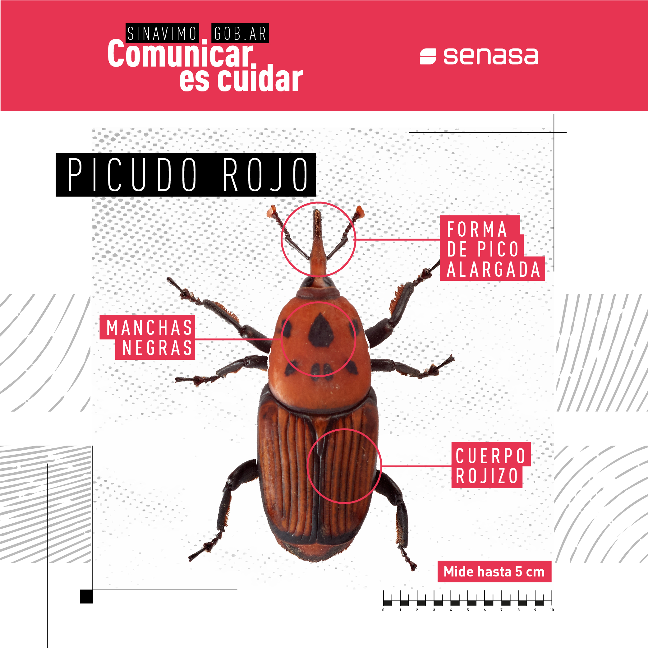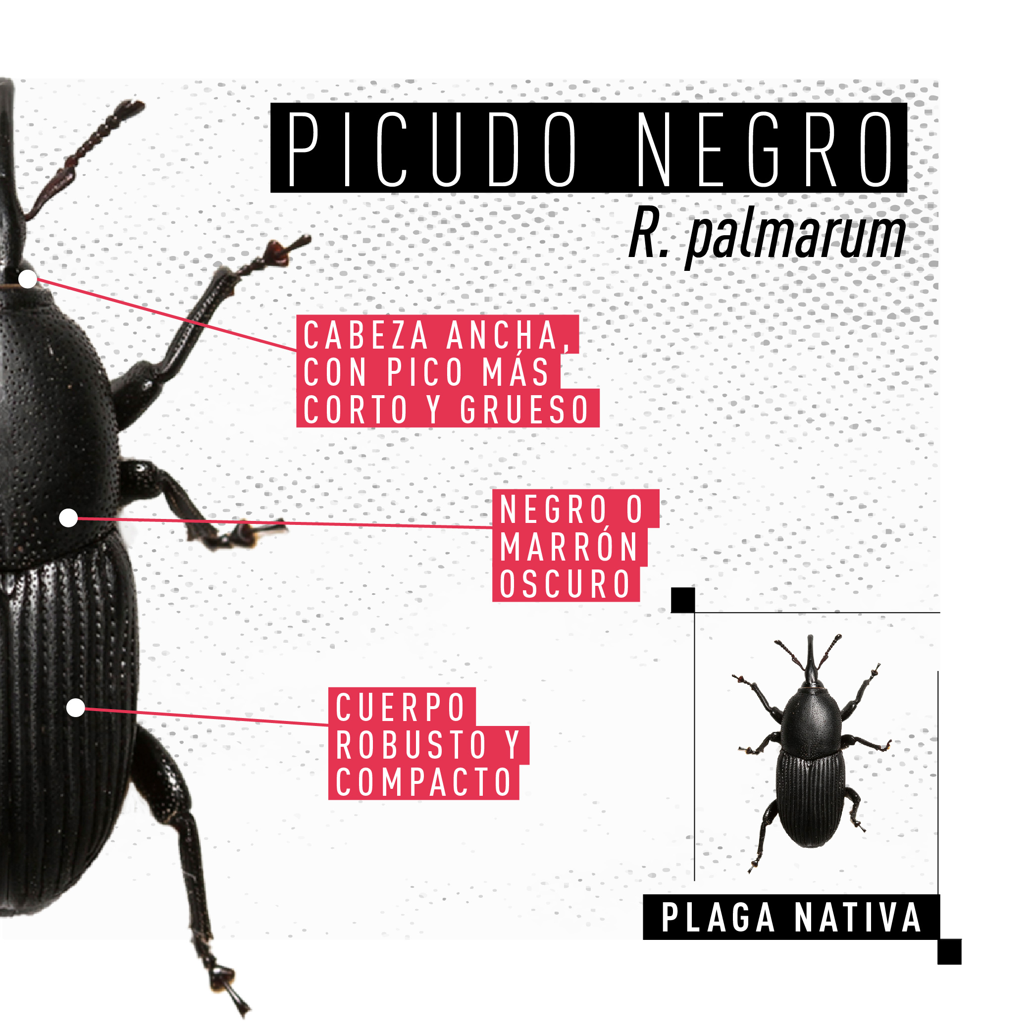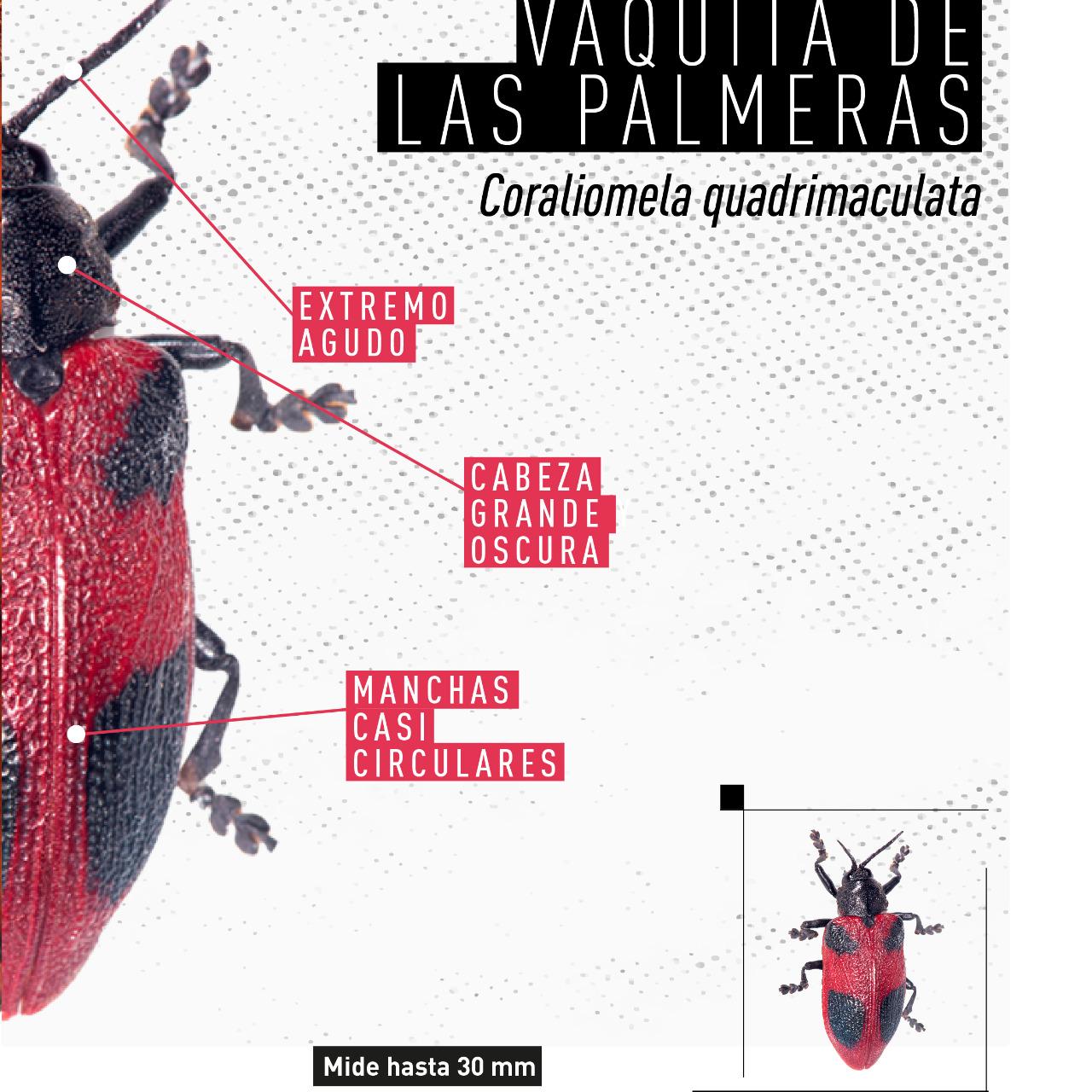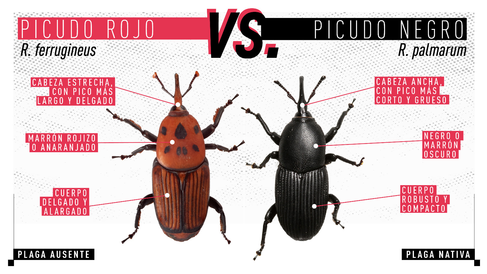 Rhynchophorus ferrugineus, conocido como picudo rojo de las palmeras, es una plaga cuarentenaria ausente en Argentina. Piezas desarrolladas para Rhynchophorus ferrugineus Picudo rojo 1.jpg Picudo rojo 2.jpg Picudo rojo vs negro 1.jpg Picudo rojo vs negro 2 - copia.jpg Picudo rojo vs negro 3.jpg Picudo rojo vs picudo negro 2.jpg Como identificar palmeras dañadas.jpg 1. Penacho.jpg 2. Forma de hongo.jpg 3. Asimetría.jpg 4. hojas.jpg Picudo rojo vs vaquita de las palmeras 1.jpg Picudo rojo vs vaquita de las palmeras 3.jpg Picudo rojo vs vaquita de las palmeras 2.jpg 1. Recomendaciones.jpg 2. Adquisición segura de palmeras.jpg 3. Reducir al minimo la poda.jpg 4. Vigilancia constante.jpg 5. No utilizar trampas de feromonas y kairomonas.jpg Descargar PDF. protocolo para la tala de palmeras.pdf Descargar PDF. protocolo seguridad.pdf